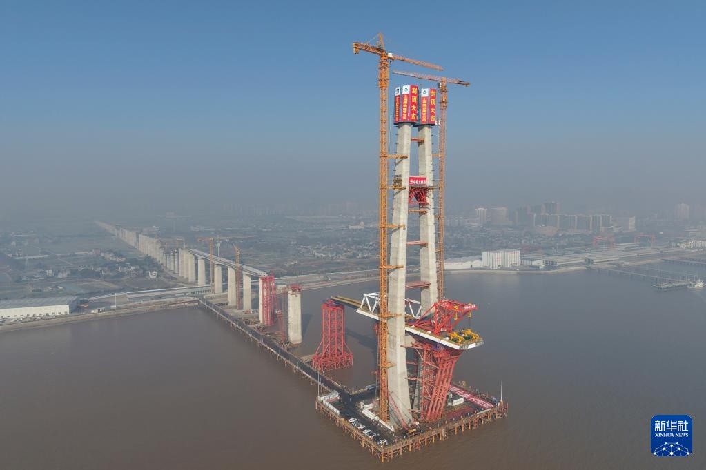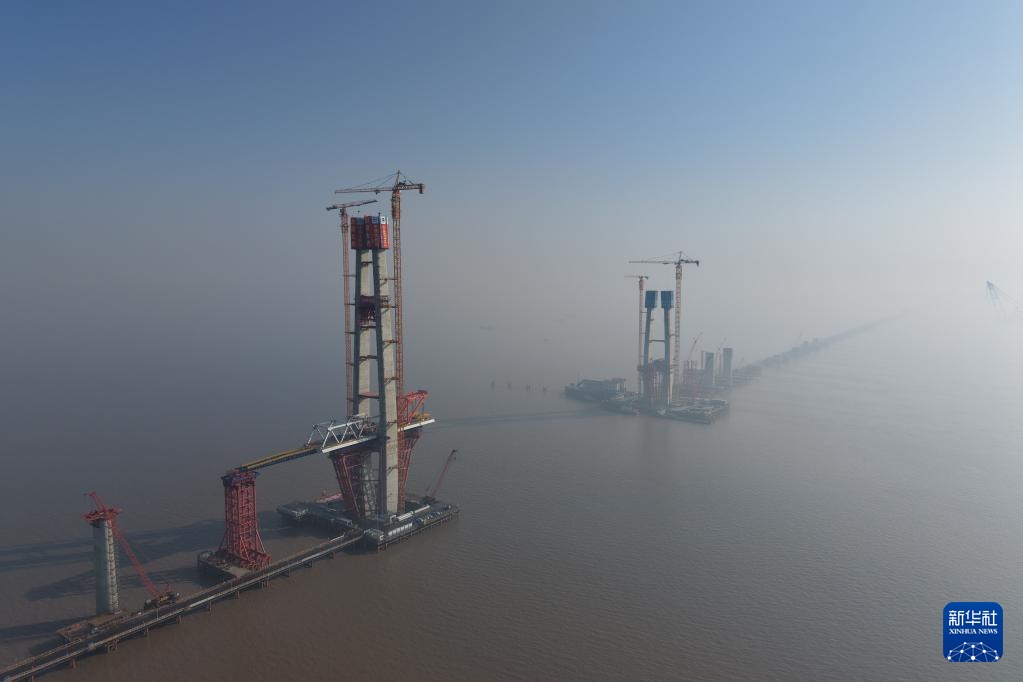 1月16日拍摄的杭州湾跨海铁路桥北航道桥8号主塔(无人机照片)。