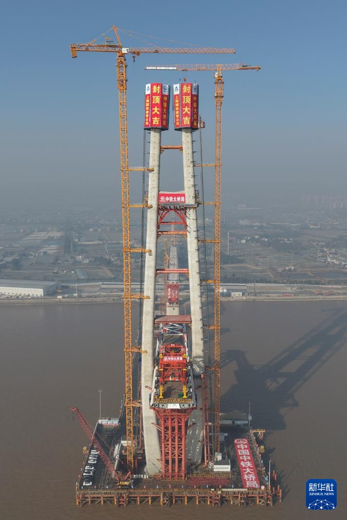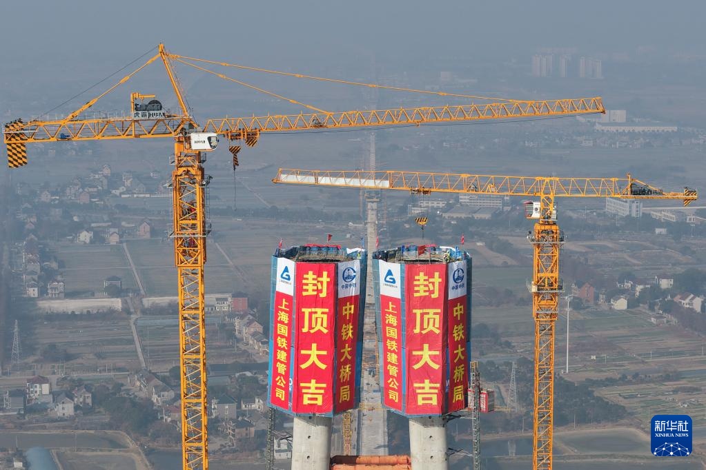 1月16日拍摄的杭州湾跨海铁路桥北航道桥,左侧为实现封顶的8号主塔(无人机照片)。