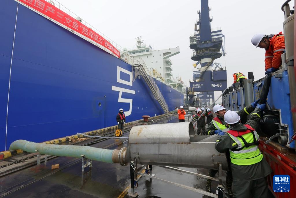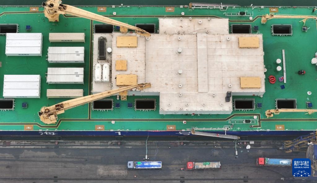 1月16日,在山东港口烟台港,工作人员将三文鱼鱼苗装入10万吨级养殖工船“苏海1号”(无人机照片)。