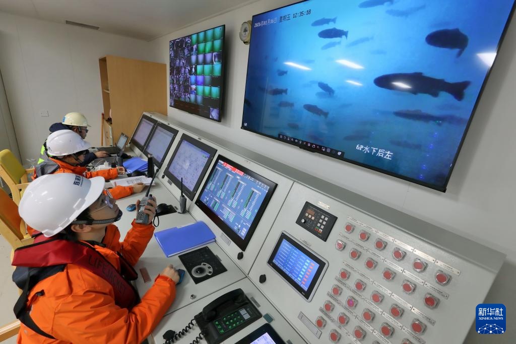 1月16日,在山东港口烟台港,养殖工船“苏海1号”的工作人员在巡查封闭式三文鱼养殖舱。