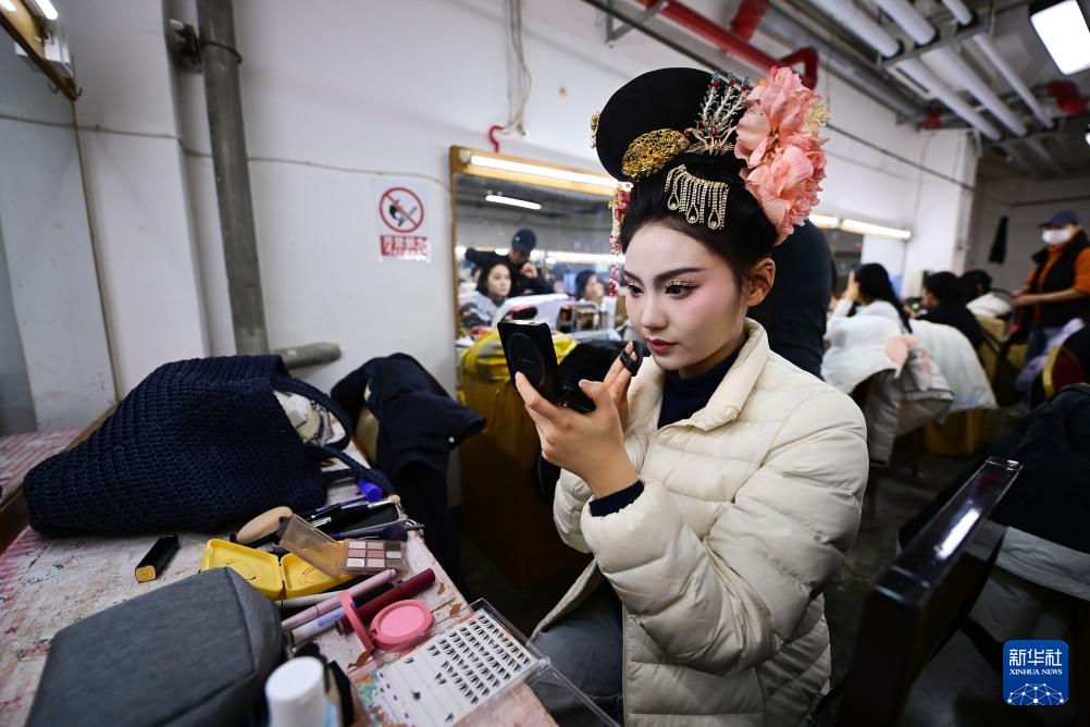 陕西省歌舞剧院的舞蹈演员在“团播”前化妆(1月15日摄)。