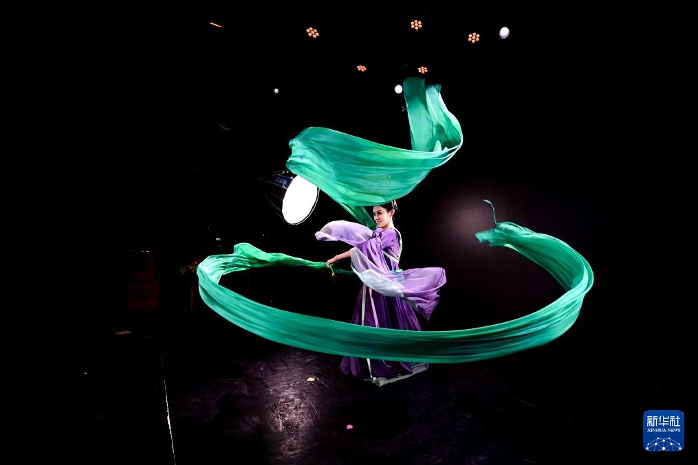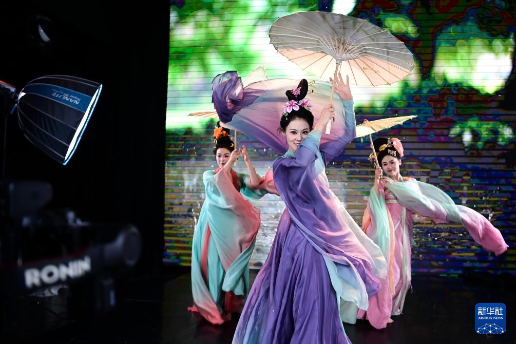 陕西省歌舞剧院的舞蹈演员在直播间进行“团播”表演(2025年12月25日摄)。