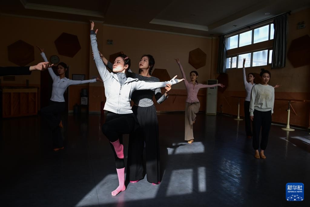 陕西省歌舞剧院的舞蹈演员在排练室进行日常训练(1月15日摄)。