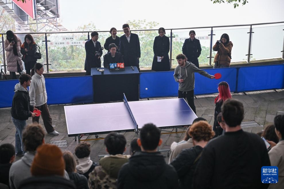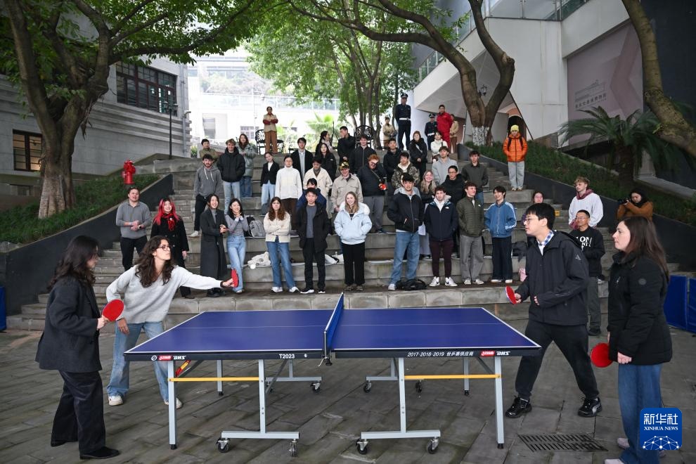 1月16日,中美青年在重庆史迪威博物馆户外平台上进行乒乓球友谊赛。