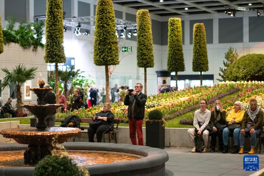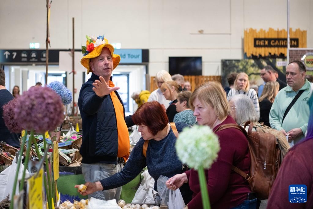 1月16日,在德国首都柏林,一名摊主(左一)在柏林国际绿色周现场叫卖花卉种球。