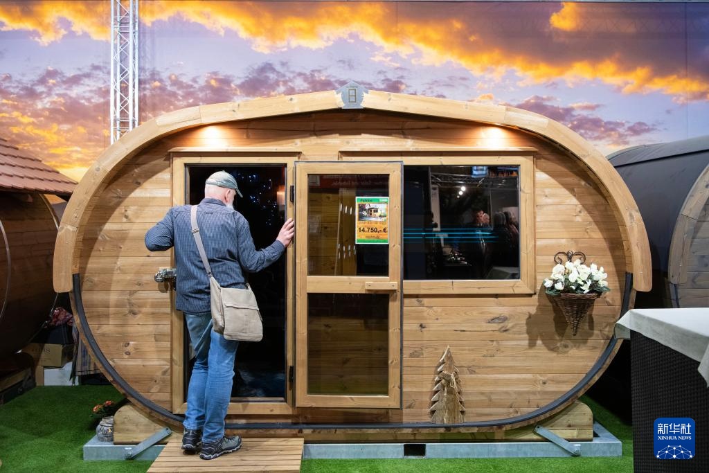 1月16日,在德国首都柏林,一名男子在柏林国际绿色周现场参观一款桑拿木屋产品。
