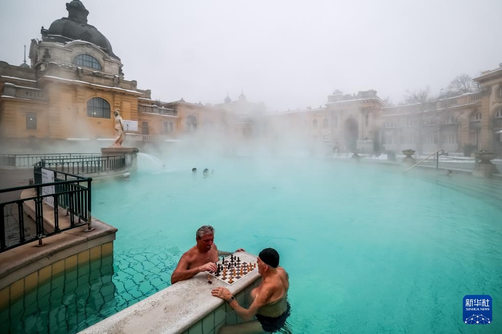 1月16日,人们在雪后的匈牙利布达佩斯塞切尼温泉中下象棋。