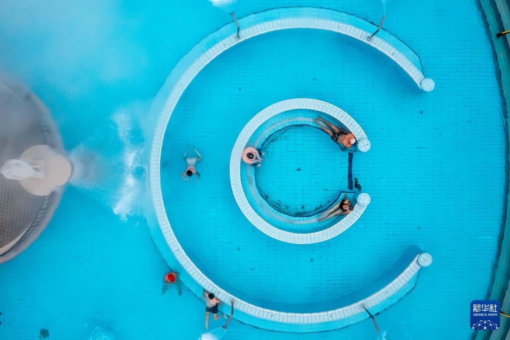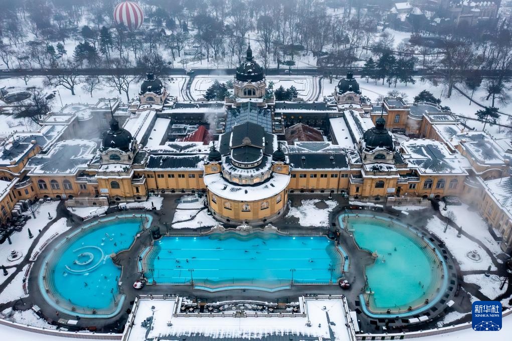 1月16日,人们在雪后的匈牙利布达佩斯塞切尼温泉休闲(无人机照片)。