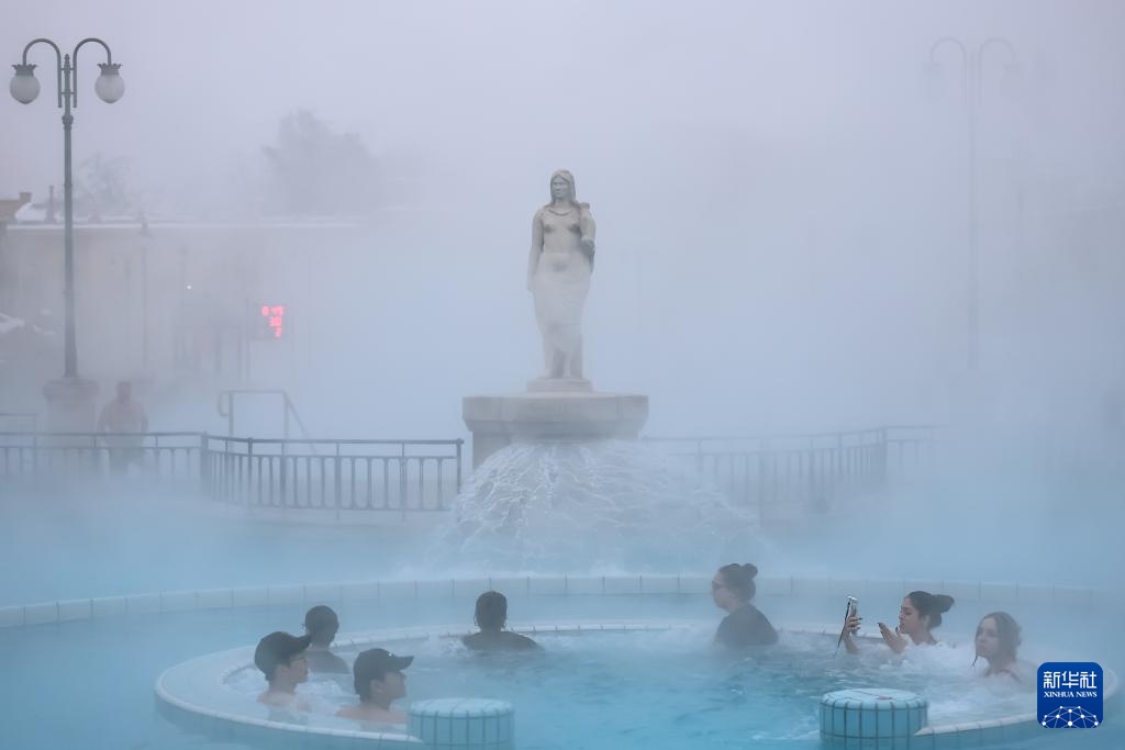 1月16日,人们在雪后的匈牙利布达佩斯塞切尼温泉休闲。