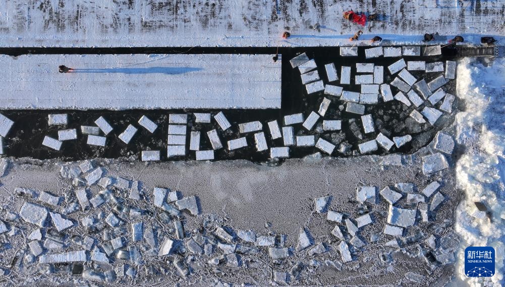 1月17日,在松花江哈尔滨段采冰现场,车辆装载着刚采上来的冰块准备运往哈尔滨冰雪大世界储冰场(无人机照片)。