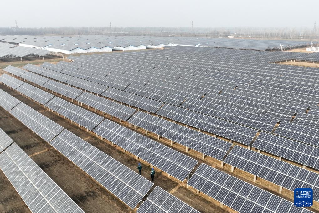 1月16日,国网巨鹿县供电公司的工人在辖区阎疃镇附近的“农光互补”光伏发电场巡检并网线路。