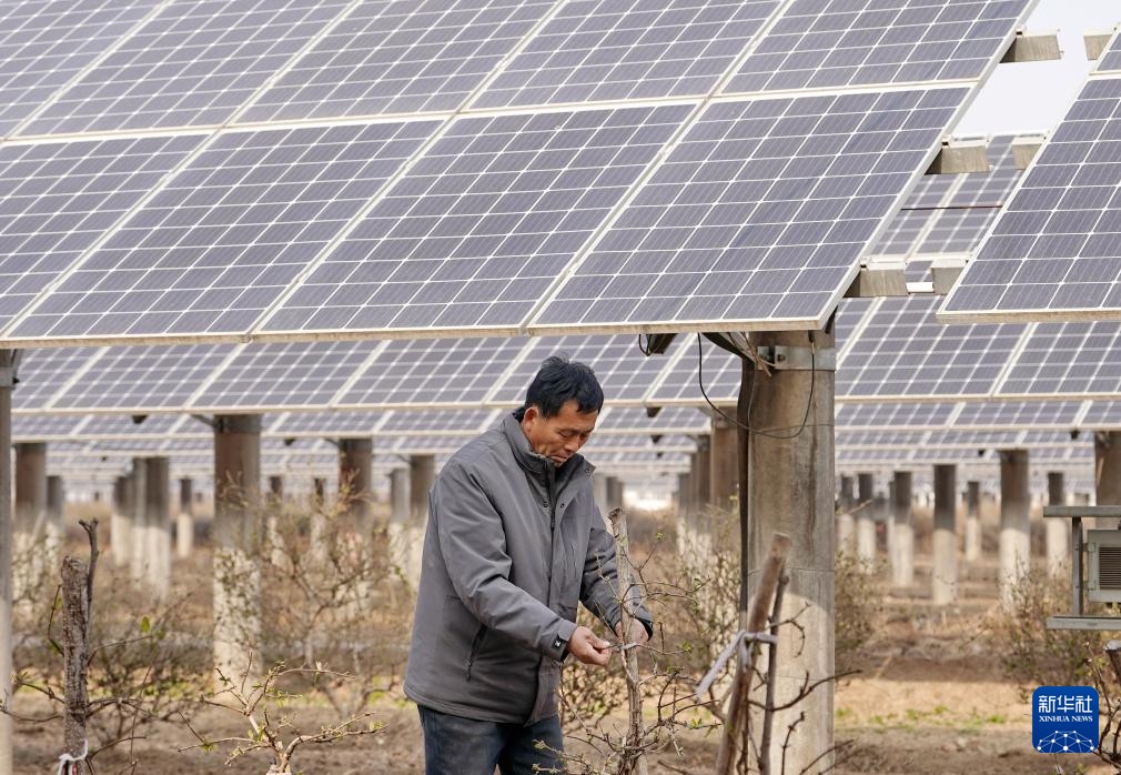 1月16日,河北省巨鹿县阎疃镇的一名农民在“农光互补”光伏板下管护金银花苗。