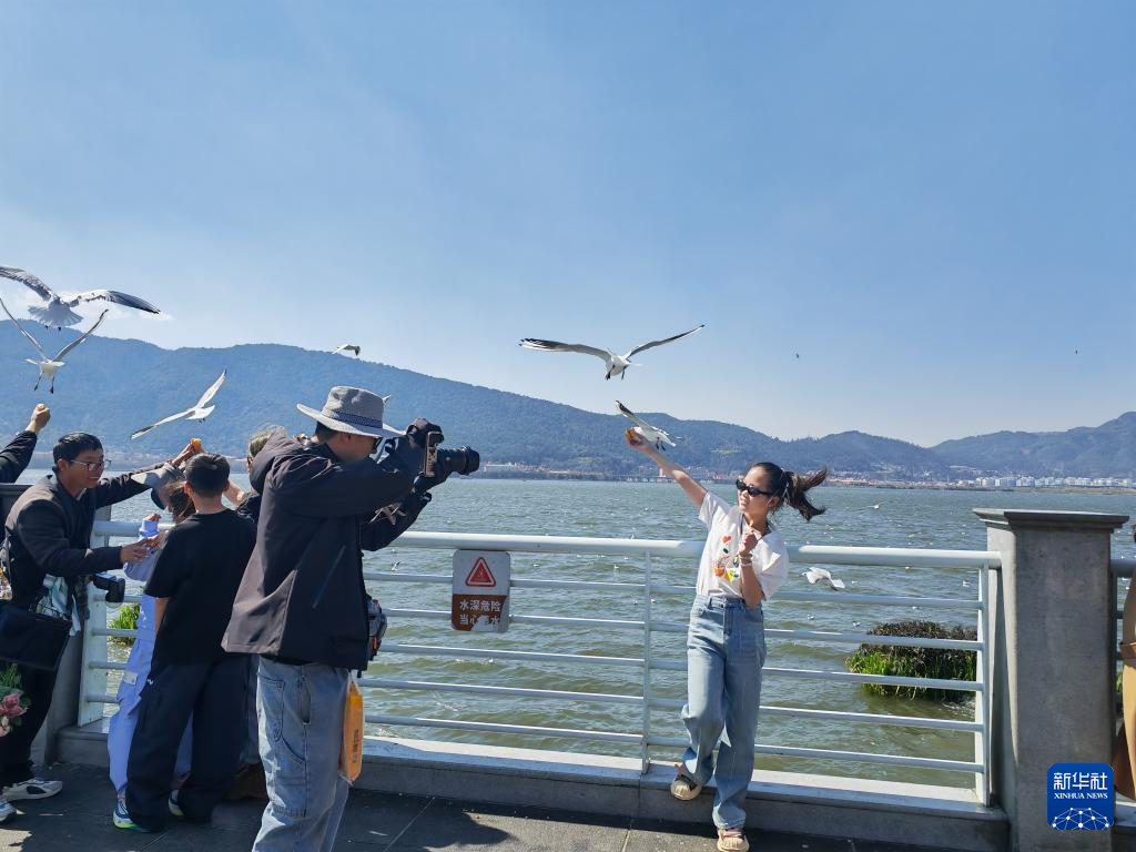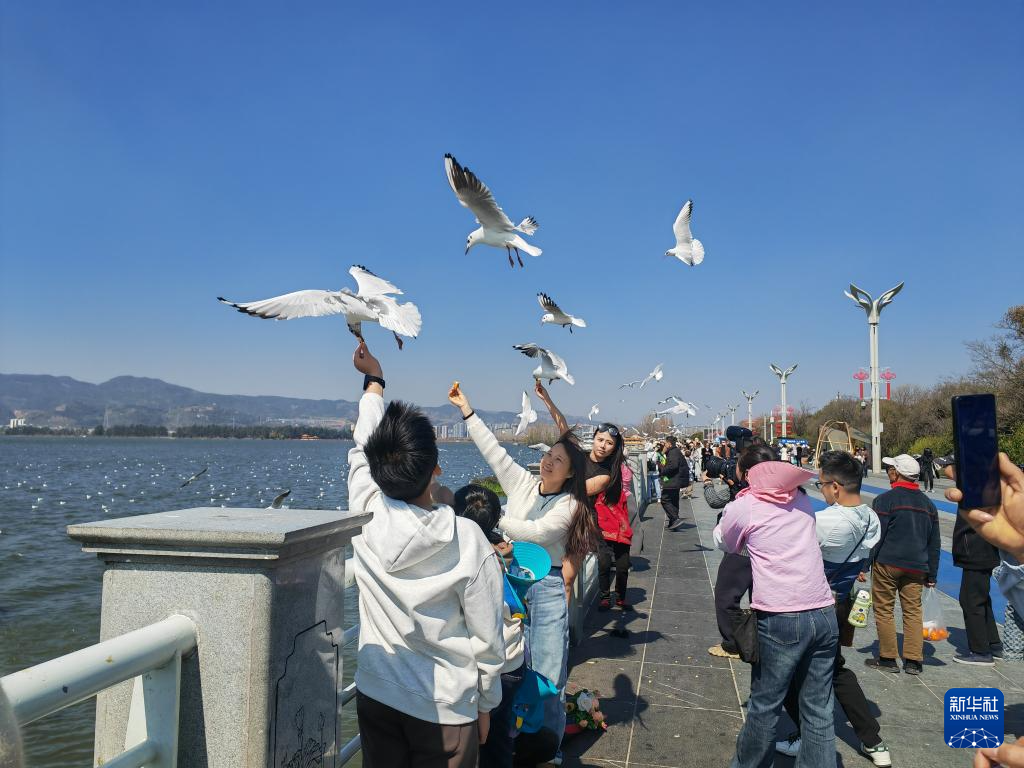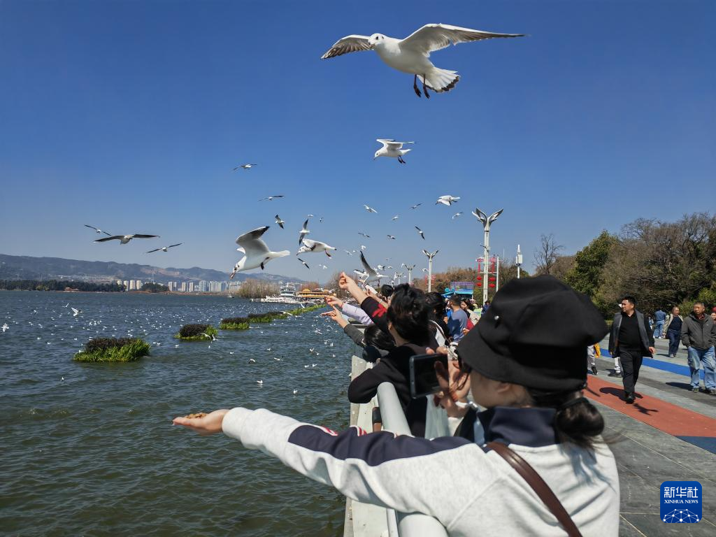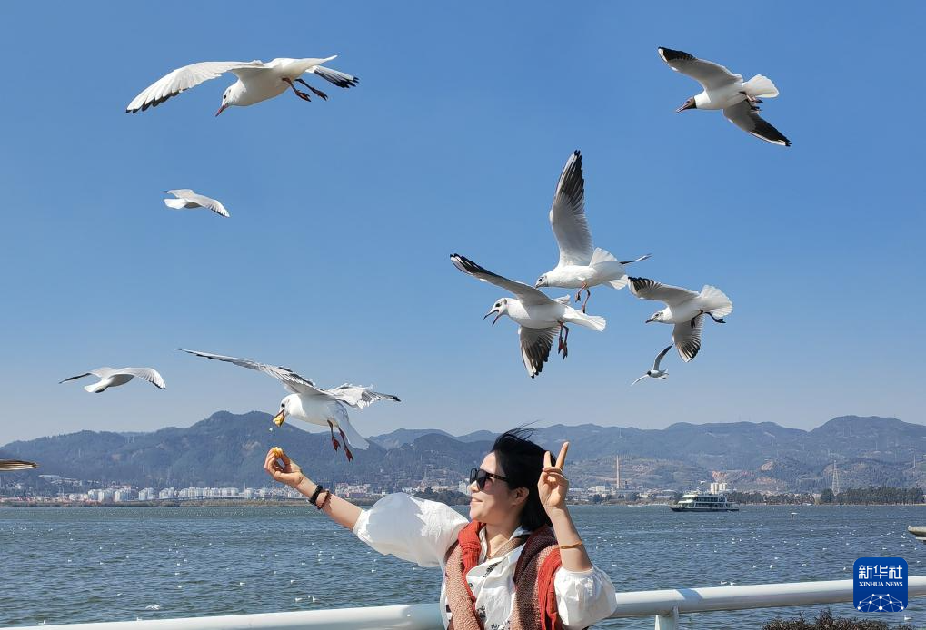除夕当天,许多游客和市民来到云南省昆明市海埂大坝,观赏越冬的红嘴鸥。