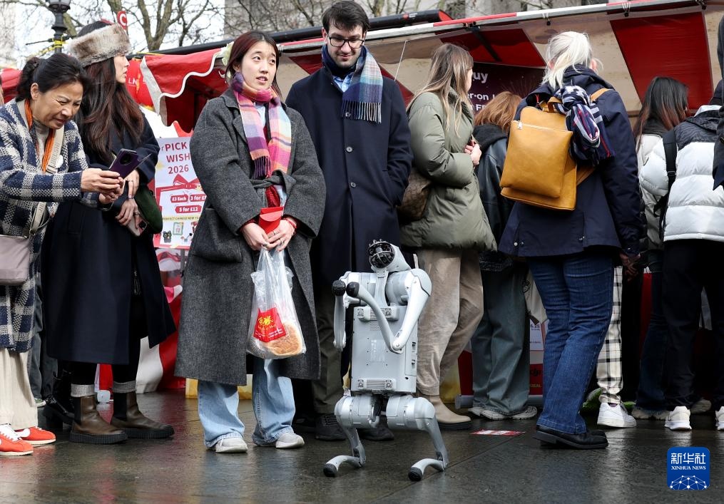 2月22日,在英国伦敦市中心的特拉法加广场春节庆典上,来自中国宇树科技的四足机器人向人们拜年。