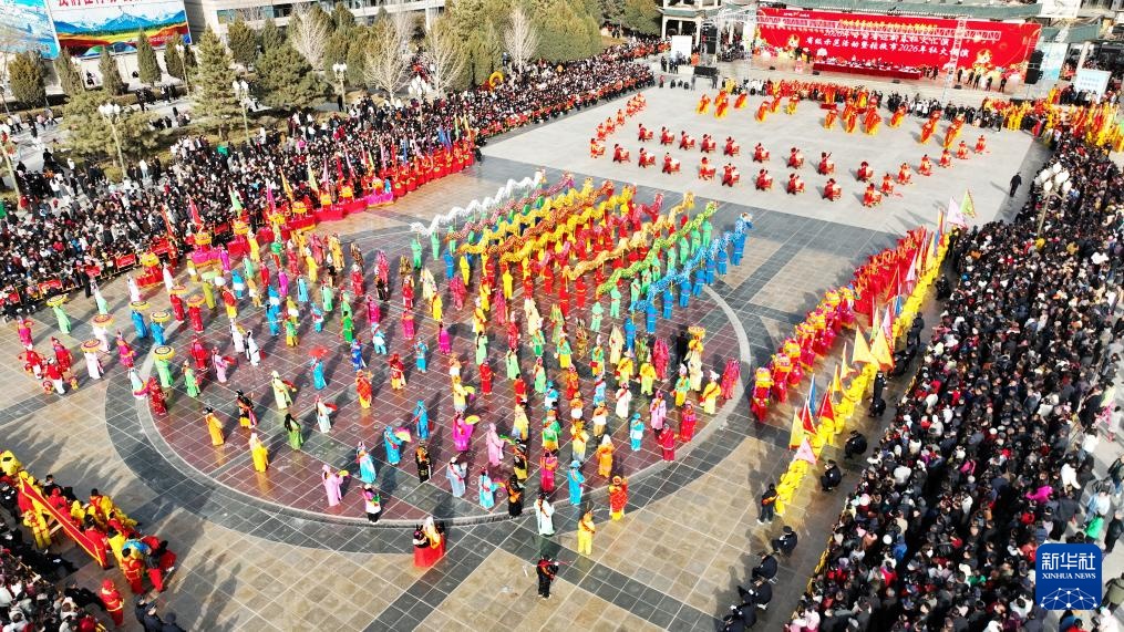 2月26日,社火队员在甘肃省张掖市中心广场集中展演(无人机照片)。