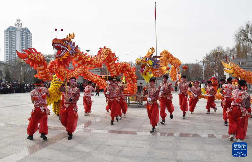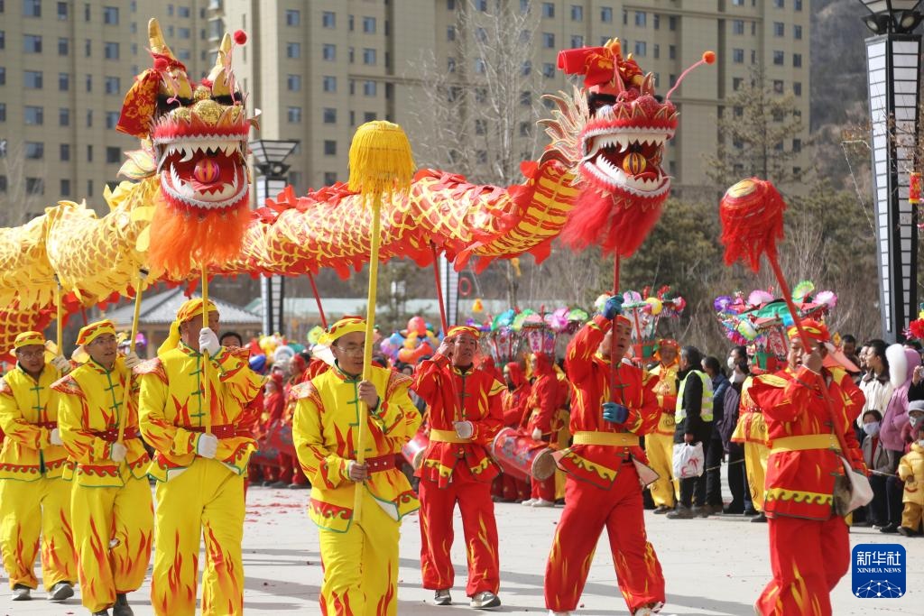 2月28日,社火队员在甘肃省永靖县表演舞龙。