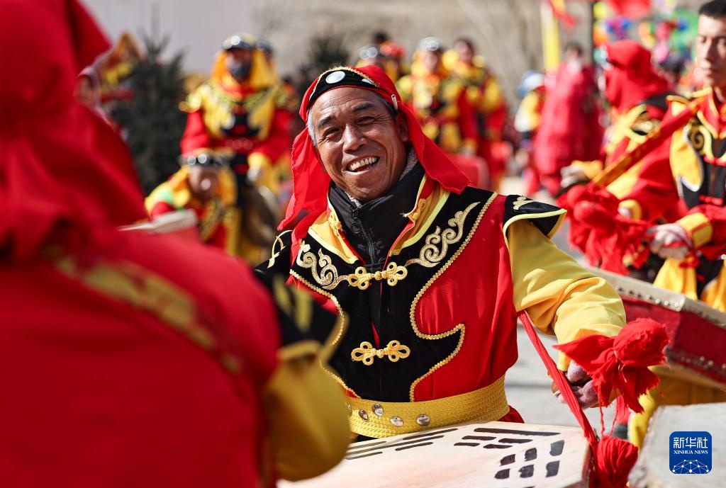 2月27日,在甘肃省定西市安定区巉口镇新坪村,唐家岔社火队员进行擂鼓表演。