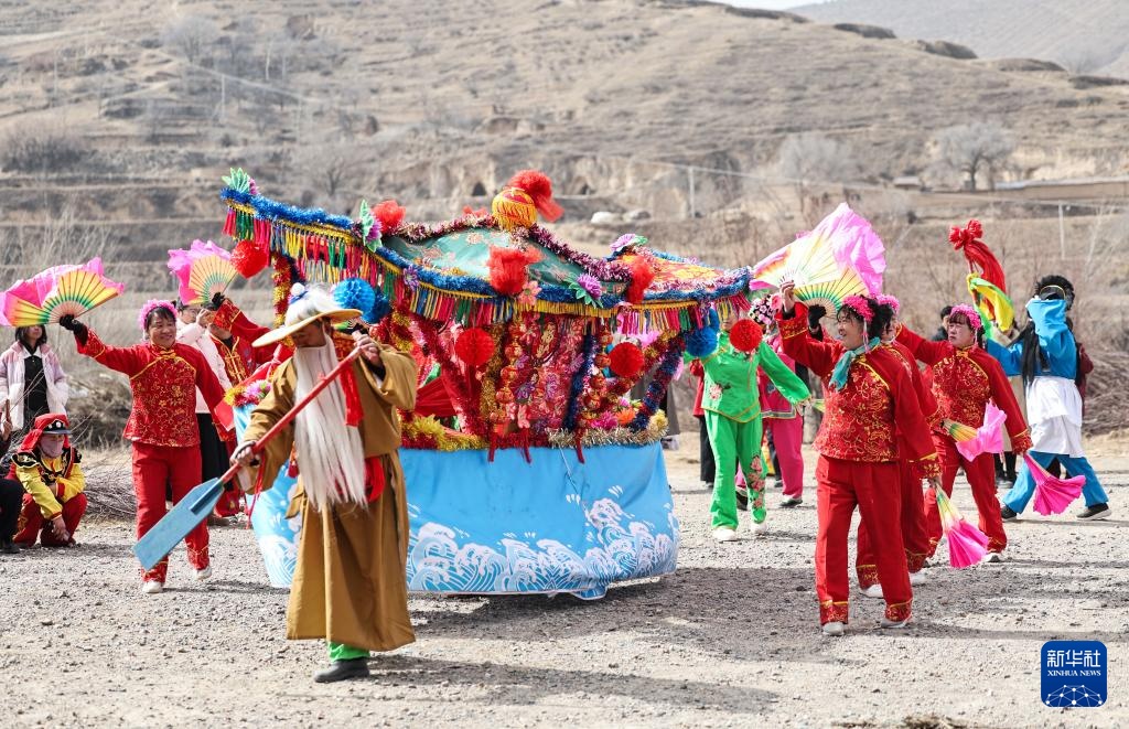 2月27日,在甘肃省定西市安定区巉口镇新坪村,刘家坡社火队员表演跑旱船。
