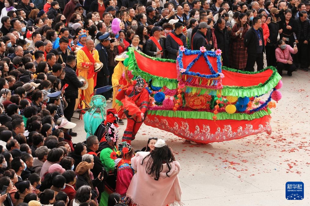 2月26日,社火队员在甘肃省定西市安定区内官营镇表演跑旱船。