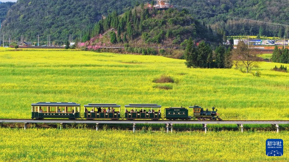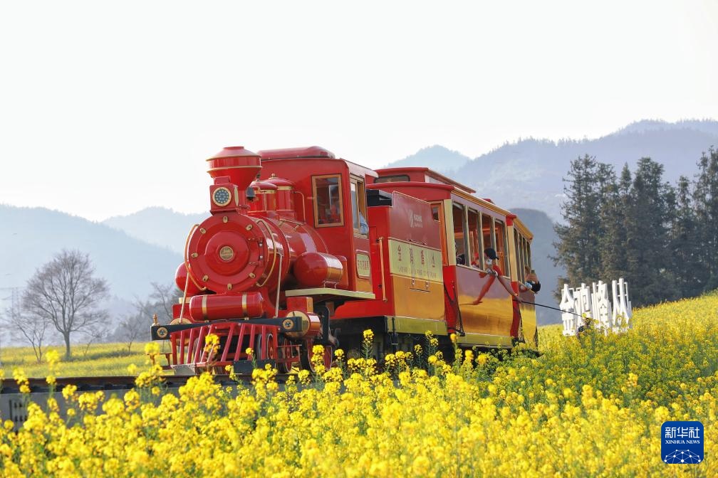 2月27日,在云南省曲靖市罗平县金鸡峰丛景区,观光小火车行驶在油菜花海中。