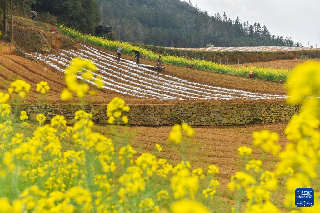 2月27日,在云南省文山壮族苗族自治州文山市东山乡,村民在田间劳作准备栽姜。