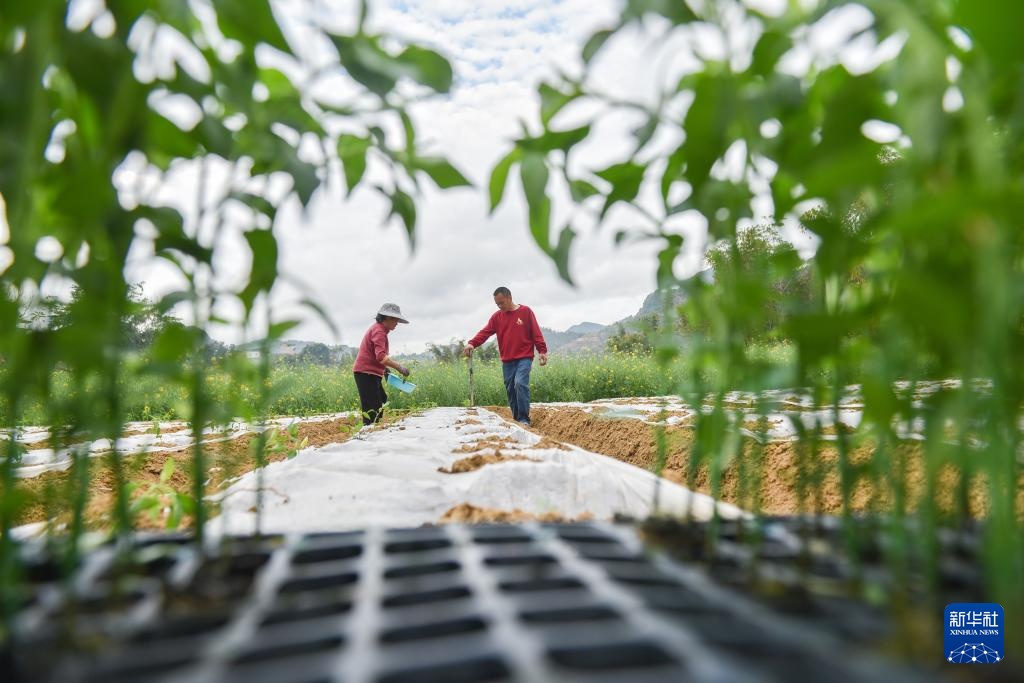 2月27日,在云南省文山壮族苗族自治州马关县马白镇文华村,农民在田间种植辣椒。