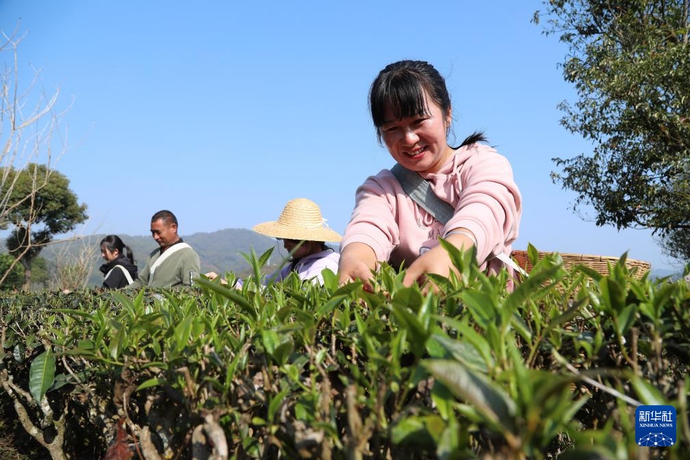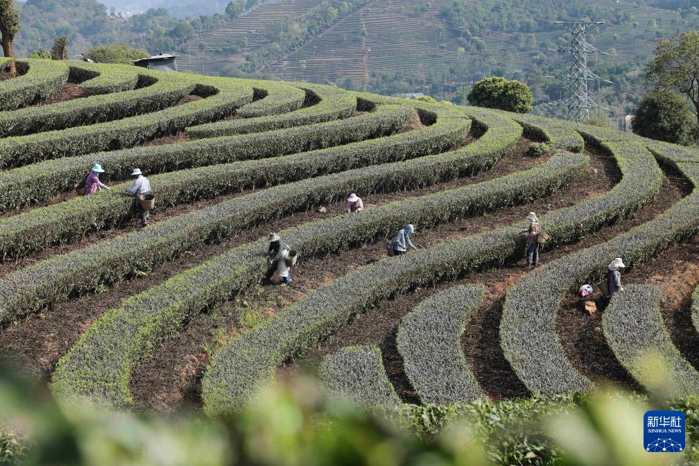 2月28日,茶农在云南省普洱市宁洱哈尼族彝族自治县宁洱镇温泉村茶园采摘春茶。