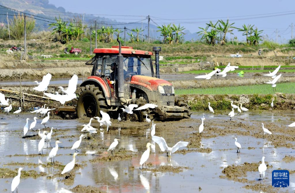 2月28日,在云南省西双版纳州勐海县勐混镇曼扫村,村民驾驶拖拉机犁田。
