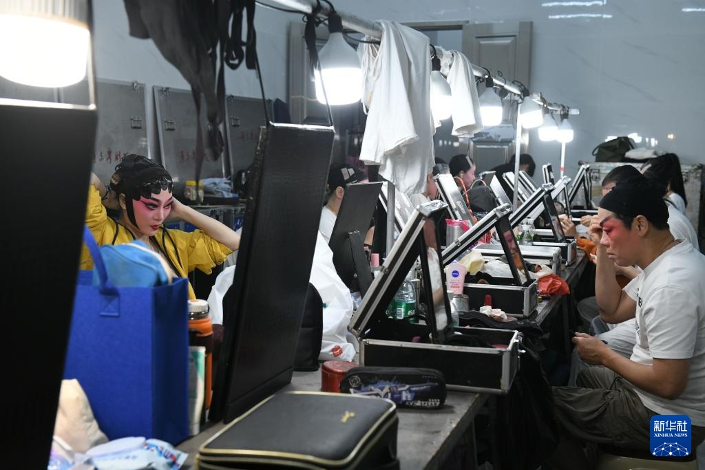 2月25日晚,在广东省湛江吴川市塘下村文化广场,广东粤剧院一团演员在后台化妆,准备演出。