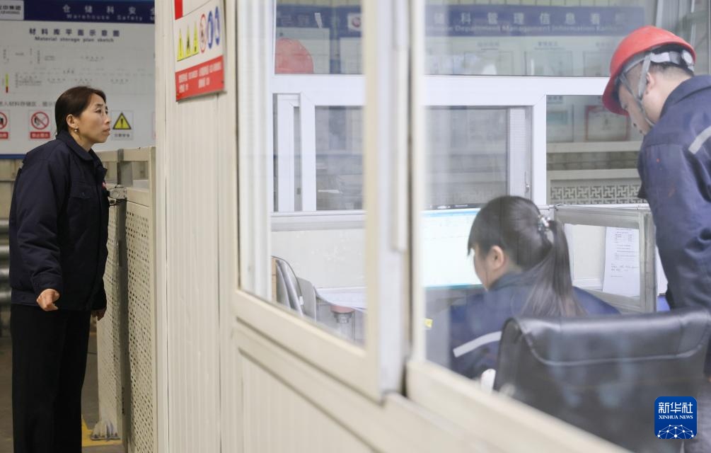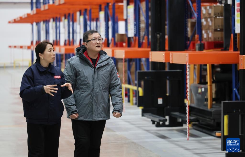 2月26日,在伍尔特(天津)电子有限公司,郭红静(左)调研智慧仓储运行情况。
