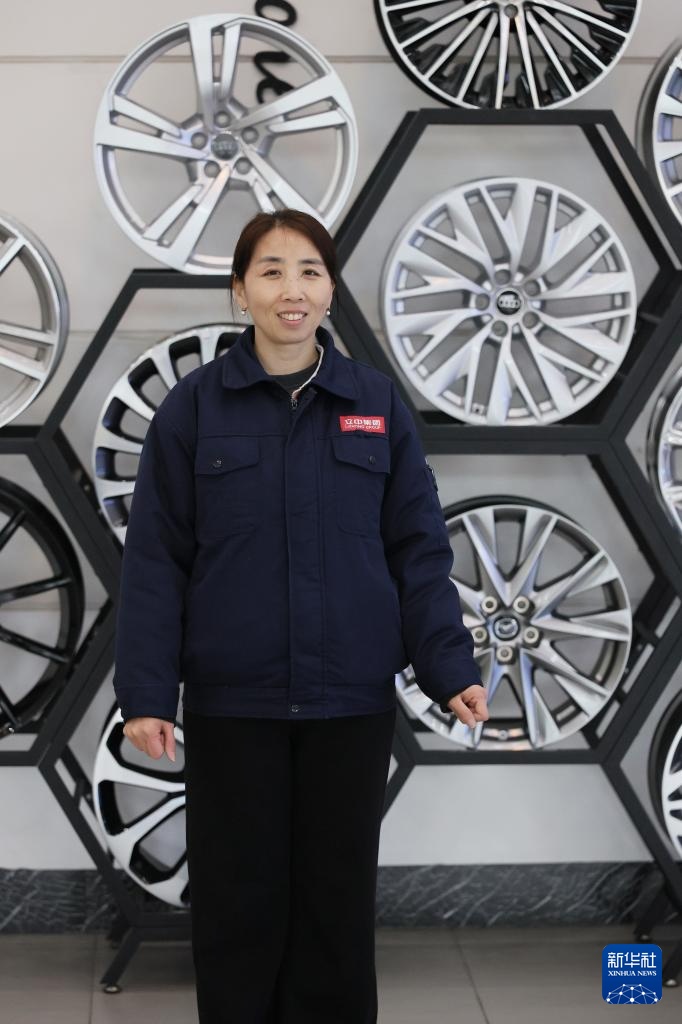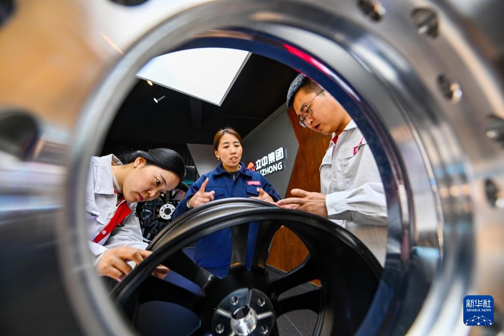 2月25日,在天津立中车轮有限公司,郭红静(中)和同事交流。