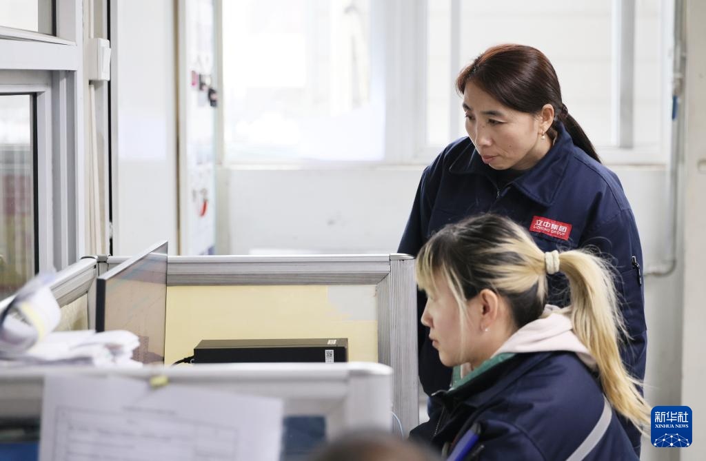 2月25日,在天津立中车轮有限公司,郭红静(后)和同事交流。