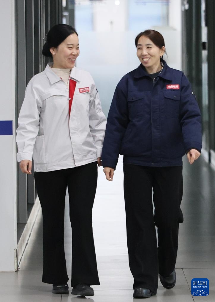2月25日,在天津立中车轮有限公司,郭红静(右)和同事交流。