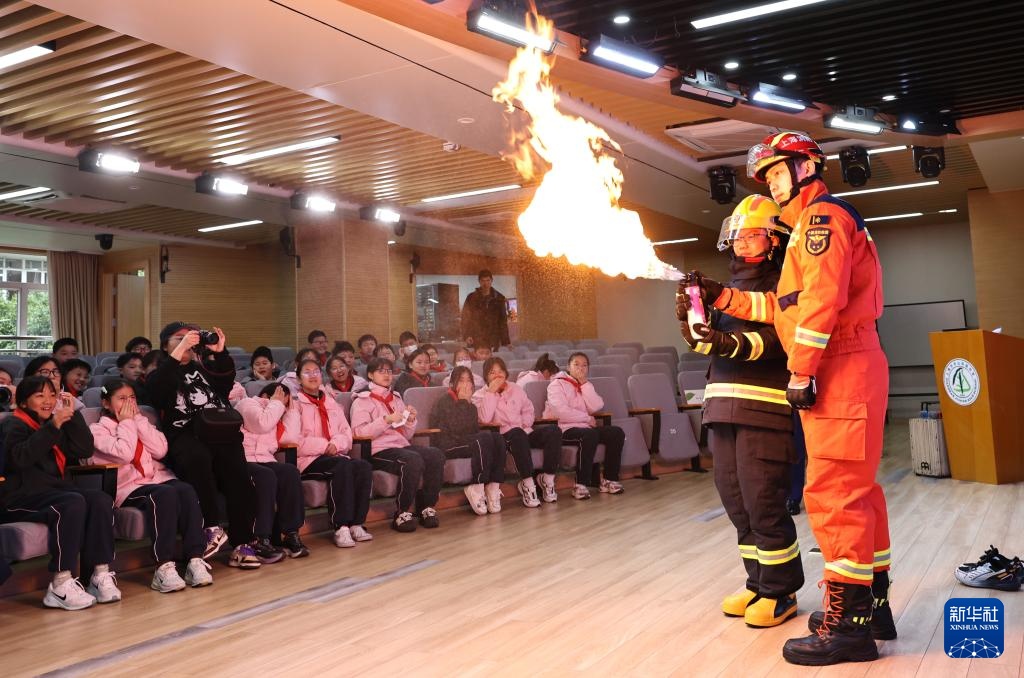 3月2日,上海市长宁区消防救援局为上海市天山初级中学学生带来一堂消防安全实训课。这是消防员在课堂上指导学生认识易燃物品的危害性。