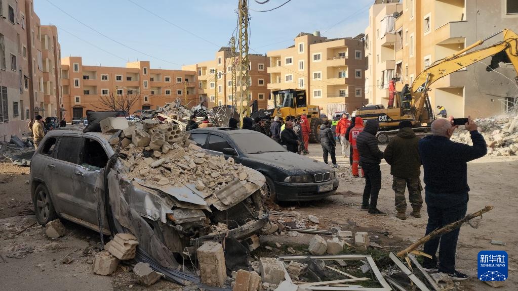 3月4日,在黎巴嫩巴勒贝克,救援人员在遭以军袭击的居民楼废墟上展开救援。