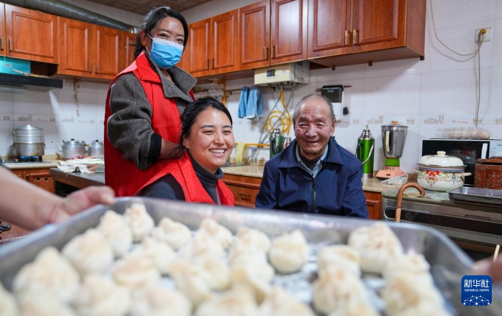 3月5日,拉萨纳金街道工作人员带上食材和辖区内的老人一起包包子。