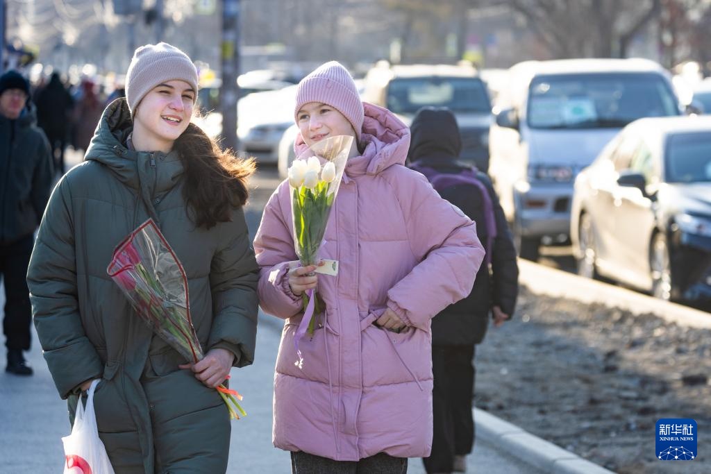 3月7日,人们手拿鲜花走在俄罗斯符拉迪沃斯托克街头。
