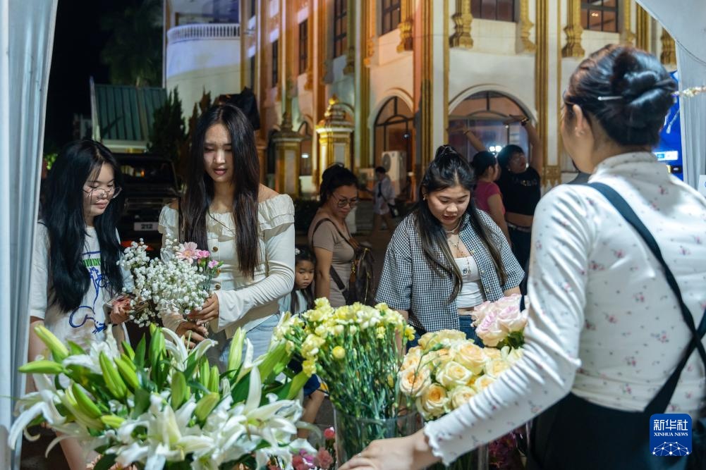 3月7日,人们在老挝万象一家鲜花销售摊位选购鲜花。