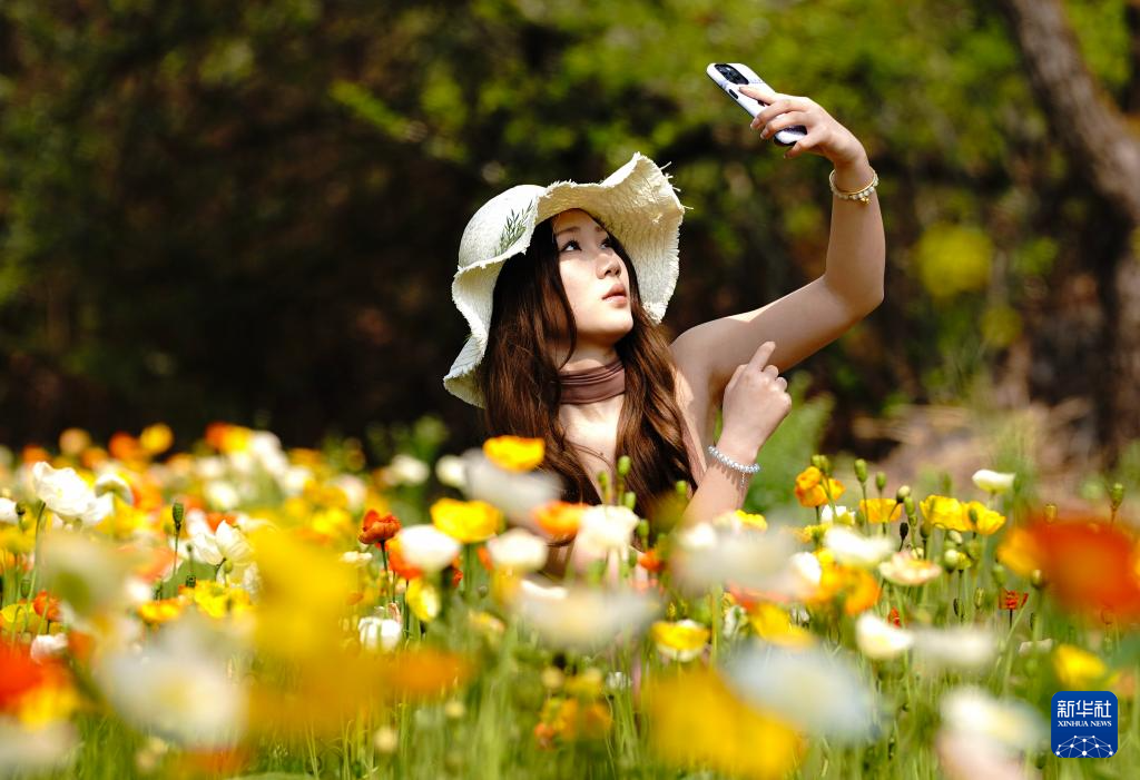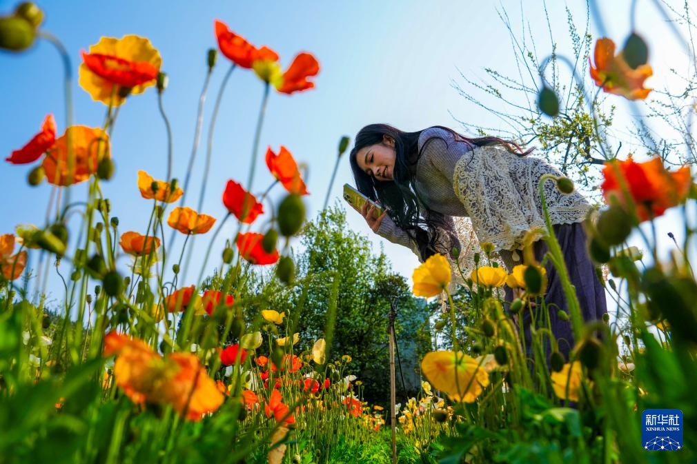 3月10日,一名游客在昆明名花谷拍摄虞美人。新华社记者 陈欣波 摄