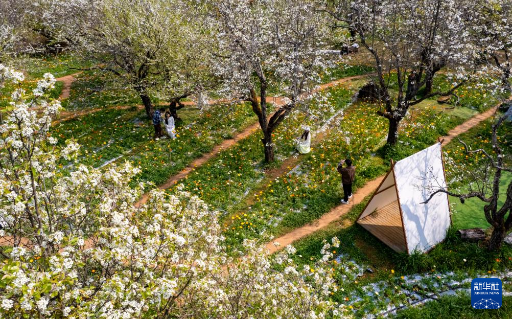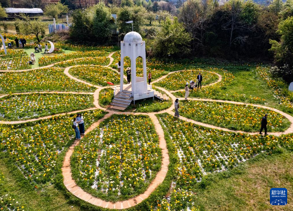 3月10日,游客在昆明名花谷拍照打卡(无人机照片)。新华社记者 陈欣波 摄