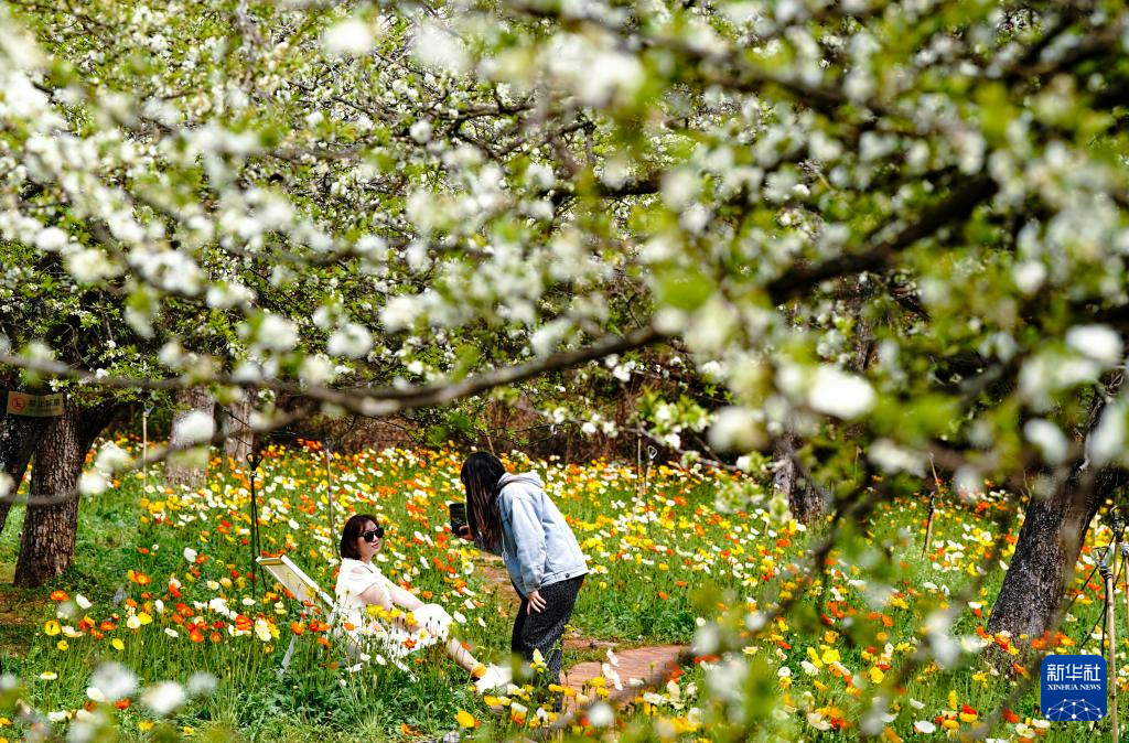 3月10日,两名游客在昆明名花谷拍照休闲。新华社记者 陈欣波 摄