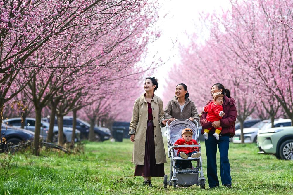 3月11日,游人在西安市鄠邑区甘河街道丁村梅花种植园内休闲。