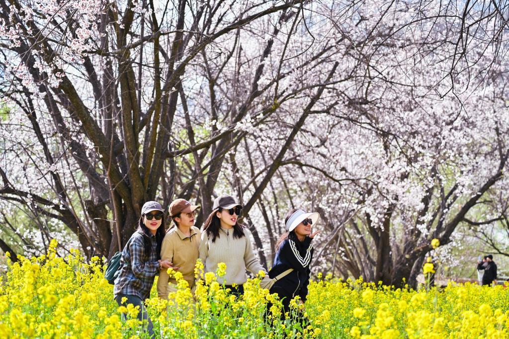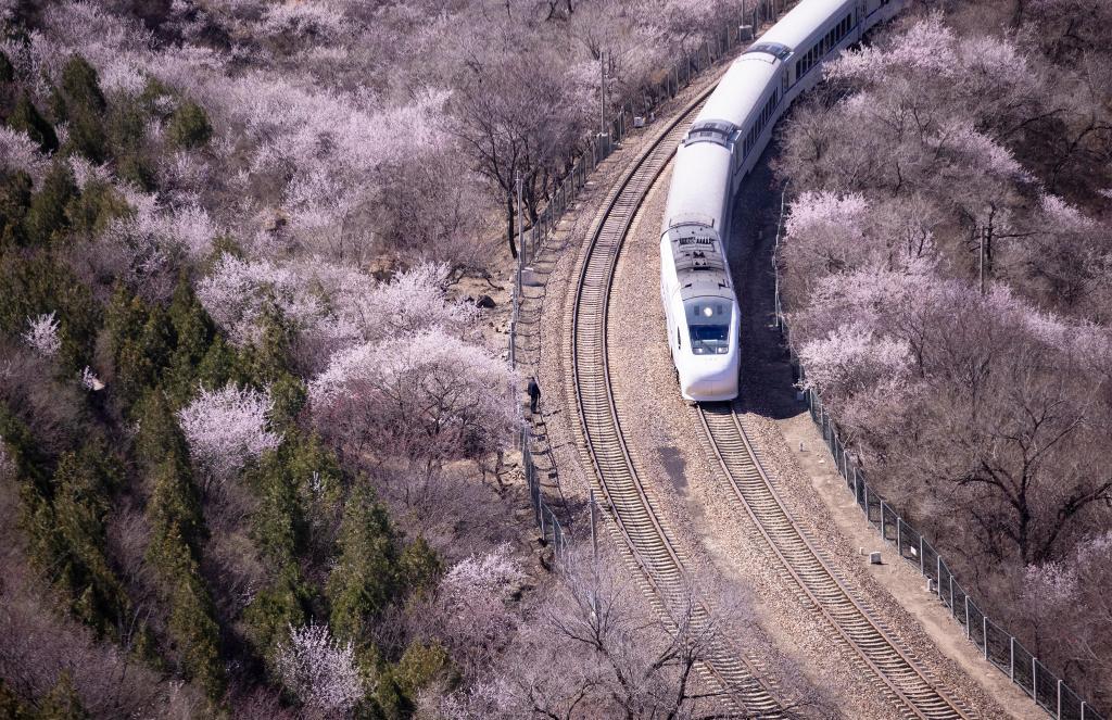 每年三月中下旬开始,在北京居庸关长城脚下,山花相继绽放。北京市郊铁路S2线的一列列火车穿行于花海间,成为春日里的一道美丽风景。