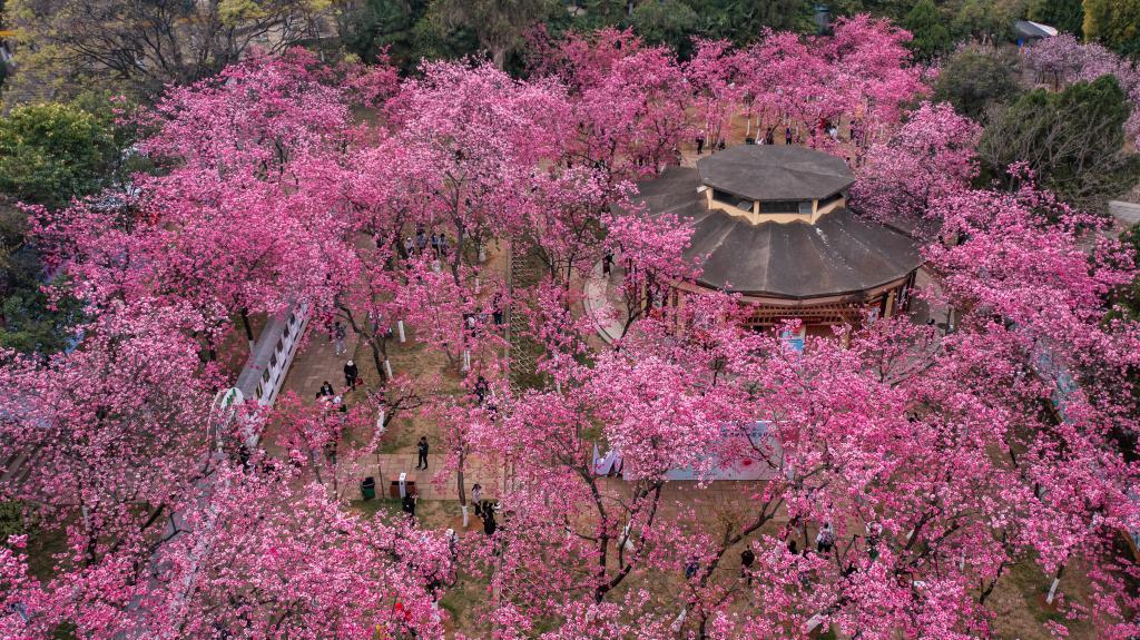 每年三月,云南昆明圆通山公园的樱花进入盛花期,吸引众多市民和游客前来观花赏景,乐享春日时光。位于圆通山公园的以“圆通樱潮·非遗雅韵”为主题的昆明动物园第26届樱花节暨第十一届“圆通樱潮”非物质文化遗产展,已于3月2日正式拉开序幕,预计樱花将于3月15日进入盛花期。
