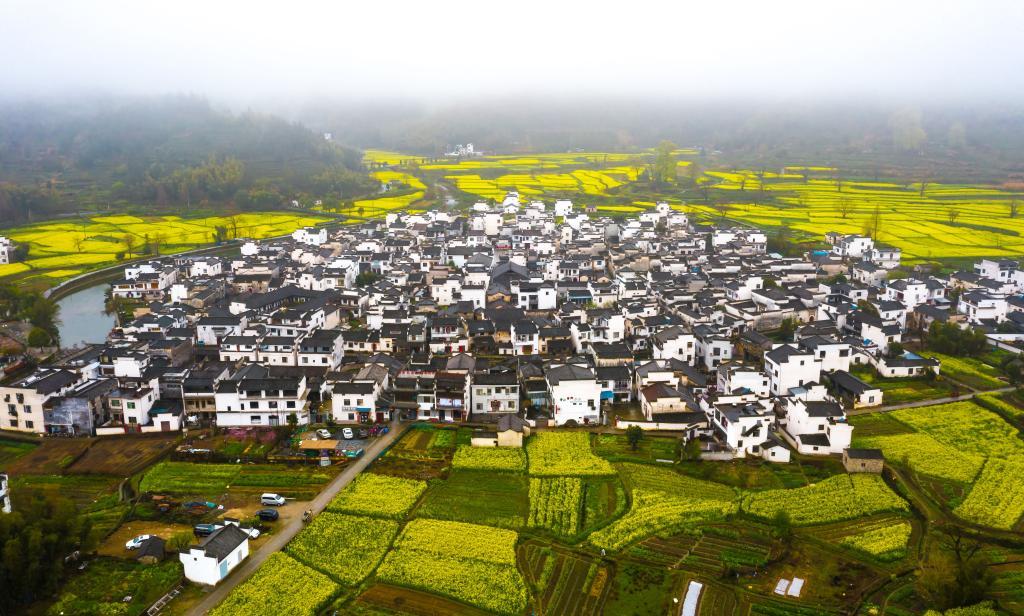 安徽黟县卢村的油菜花与村里的房屋互相点缀
