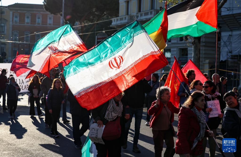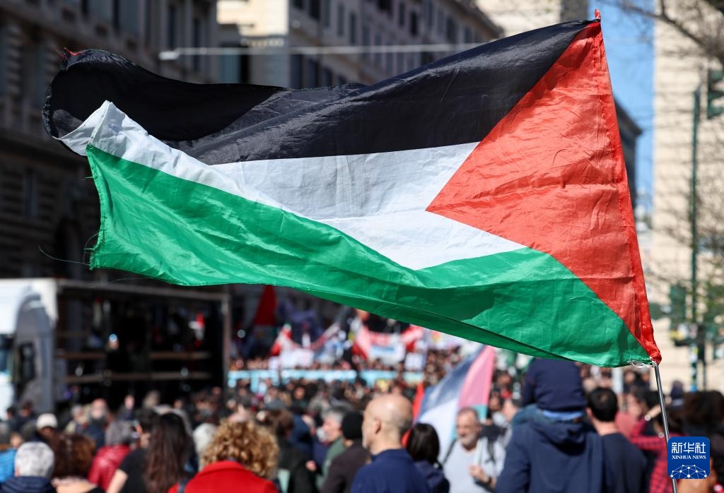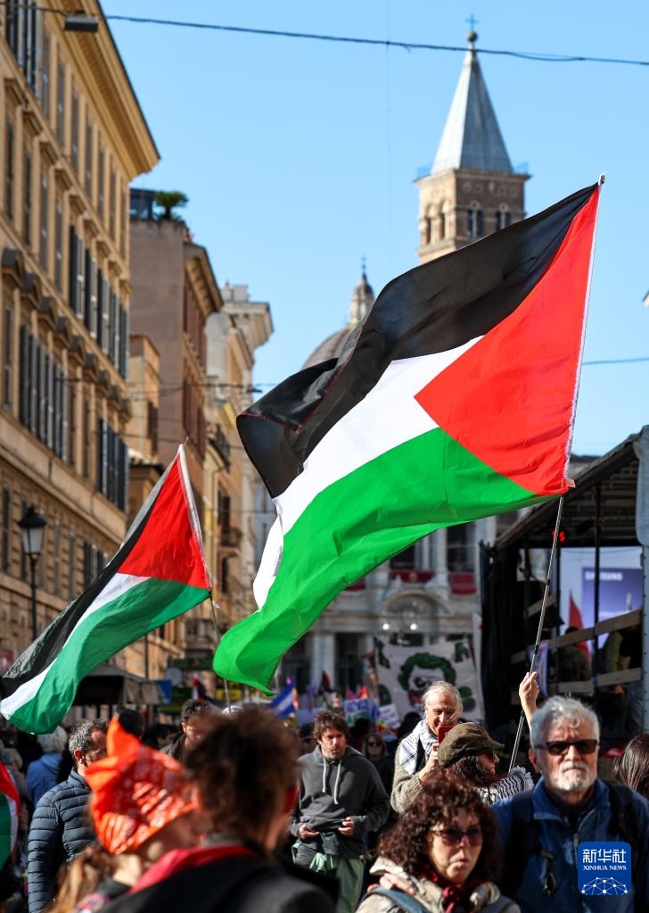 3月28日,意大利首都罗马举行反战游行,人们在活动中声援巴勒斯坦、伊朗等国。