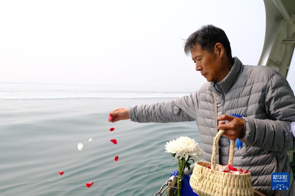 3月29日,逝者家属在完成骨灰海葬仪式后将花瓣撒向大海。