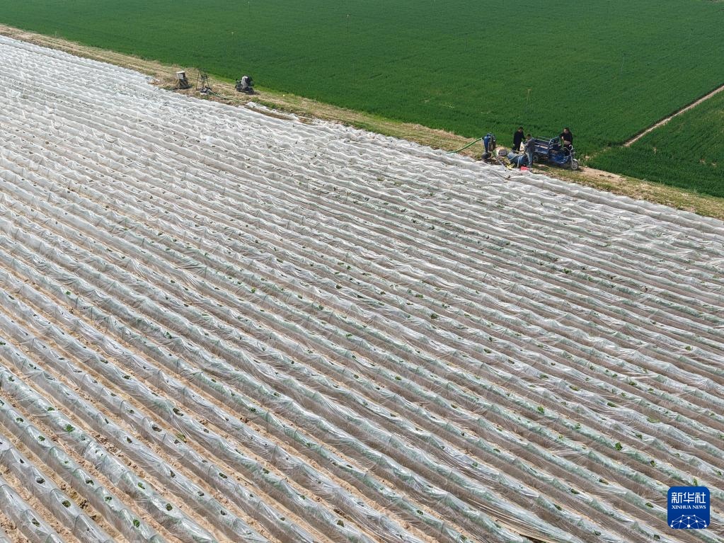 3月28日,河南省焦作市温县黄河街道东张王庄村村民在田间覆盖地膜(无人机照片)。