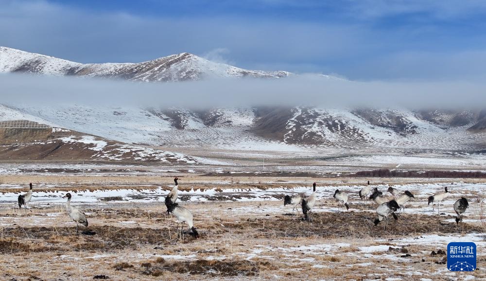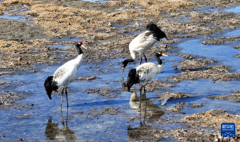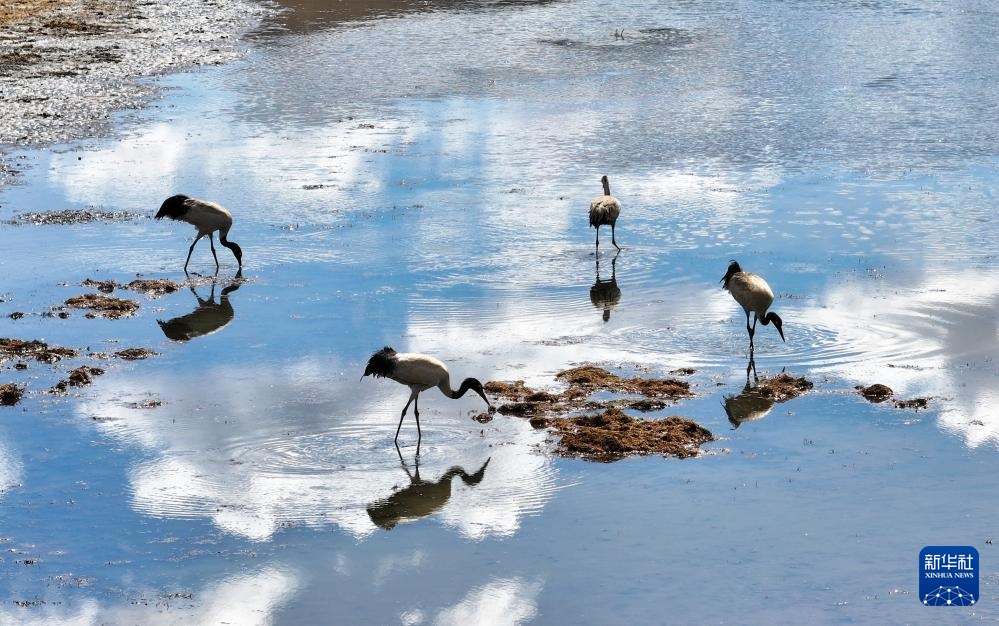 3月29日,黑颈鹤在嘎曲河红原县月亮湾段觅食。