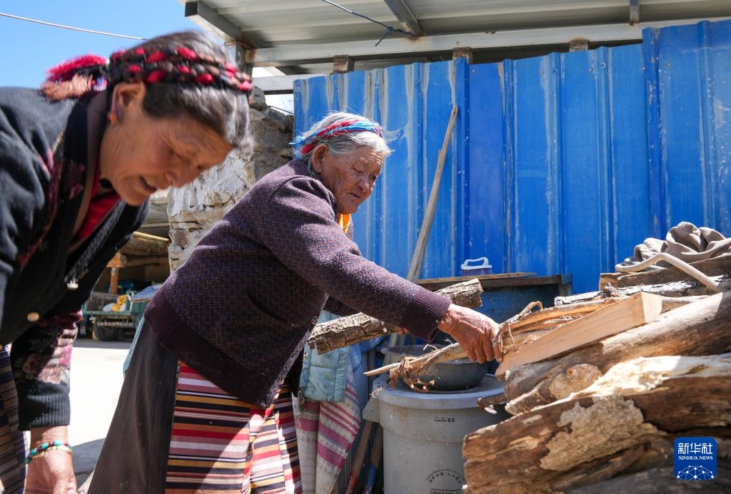 次仁桑姆(右)和女儿在整理家里的木材堆(3月26日摄)。